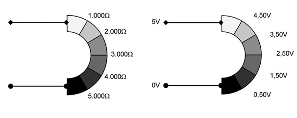 • O potenciômetro é um elemento construído com uma resistência elétrica (pista do potenciômetro). Sendo o potenciômetro alimentado com tensão elétrica, haverá um nível de tensão definido para cada ponto da pista.