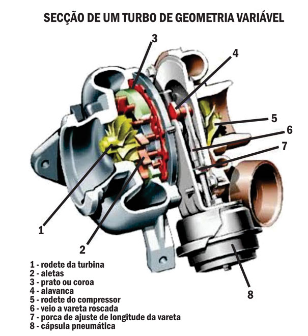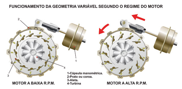 As aletas variáveis entre a voluta e o rotor de turbina influenciam o comportamento de aumento de pressão de escape, atuando, portanto, no trabalho extraído pela turbina. Em baixas rotações do motor, a seção transversal é reduzida pelo fechamento das palhetas. A pressão de sobrealimentação, e como conseqüência o torque, aumentam como resultado da maior razão de expansão na turbina. Em rotações altas do motor, as palhetas abrem de forma gradual. A pressão de sobrealimentação requerida é atingida com uma menor razão de expansão, influenciando positivamente o consumo de combustível. Durante a aceleração do veículo a partir de baixas velocidades, as palhetas são fechadas para aproveitar ao máximo a energia dos gases de exaustão. Com aumento na velocidade, as palhetas são abertas para otimizar a operação naquele ponto.