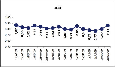 Pela segunda vez no ano, o IGD atinge 0,86 ponto, mesmo nível medido na segunda quinzena de fevereiro; só fica atrás para o primeiro período de janeiro, quando IGD medido foi de 0,87 ponto