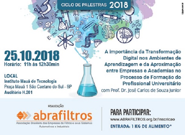 A Abrafiltros – Associação Brasileira das Empresas de Filtros e seus Sistemas – Automotivos e Industriais, promoverá, no dia 25 de outubro, a palestra “A importância da Transformação Digital nos Ambiente de Aprendizagem e da Aproximação entre Empresas e Academias no Processo de Formação do Profissional Universitário”, com o Prof. Dr. José Carlos de Souza Junior, reitor e professor dos cursos de Engenharia Elétrica e Eletrônica do Centro Universitário do Instituto Mauá de Tecnologia. A convite da reitoria do Instituto Mauá de Tecnologia - IMT, a palestra será realizada em suas instalações e não na sede da associação em Santo André.