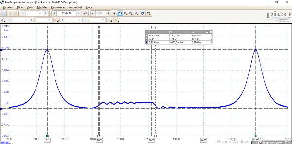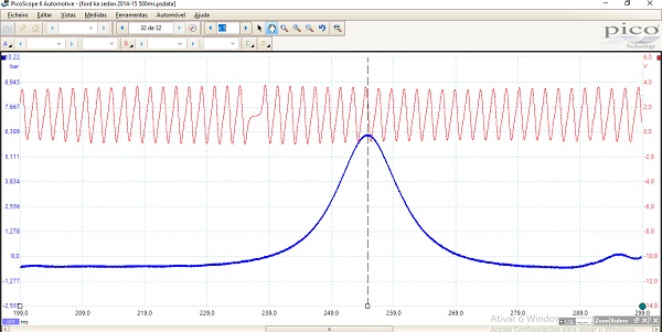Após a confirmação que o sincronismo virtual estava correto, continuei as verificações agora, confirmando o sincronismo entre o sensor de rotação e o sinal de pressão do primeiro cilindro utilizando o transdutor do picoscope WPS500x.