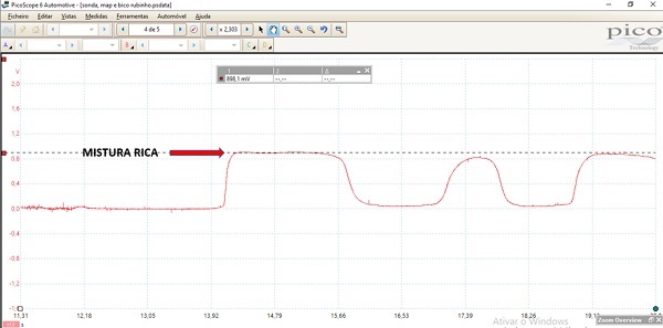 Nessa situação específica a sonda lambda ou sensor de oxigênio irá mostrar um valor de tensão superior a 450mV, ou seja, irá refletir uma condição de mistura rica.