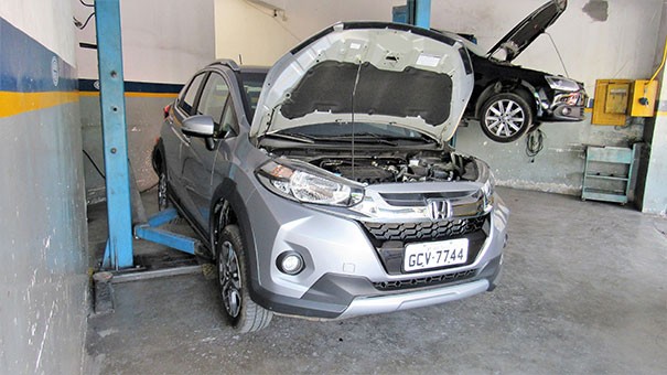 As diferenças do WR-V em relação ao Fit, portanto, se restringem mais à sua personalidade e aos detalhes. O crossover é um pouco mais talhado para as aventuras com um vão livre do solo e ângulos de ataque e saída compatíveis com o de SUVs maiores. Pormenores da suspensão, carroceria, rodas e de alguns outros componentes exclusivos do WR-V igualmente confirmam essa vocação, que, no entanto, não deve ser levada a extremos. Isso porque o carro tem limites, conforme detectaram os testes dinâmicos realizados por três oficinas escolhidas entre as que compõem o Guia de Oficinas Brasil e que entraram no radar da equipe do Jornal Oficina Brasil no final do ano passado, quando essa assumiu o volante de um Honda WR-V EXL 1.5 AT avaliado em R$ 83.745 mil pela Tabela Fipe. O veículo cedido pela Honda foi conduzido às oficinas Mack Auto Service, no bairro do Jabaquara; Autofix Serviços Automotivos, no Brooklin; e Pneus Nova Cantareira, em Santana; todas na cidade de São Paulo (SP). Nelas, o veículo foi examinado pelos reparadores...