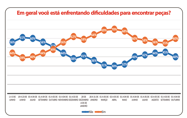 Por outro lado, a preocupação com a percepção de falta de peças deu um salto de 5 pontos percentuais, atingindo um patamar de 60%, equivalente ao mês de Junho..