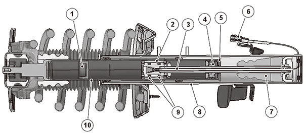 Em um amortecedor normal, o êmbolo se desloca de um lado para o outro porque uma parte do amortecedor está fixado na massa suspensa e o outro lado está fixado à massa não suspensa e esse movimento força o fluido dentro do amortecedor a passar por um orifício calibrado, gerando um amortecimento do movimento.