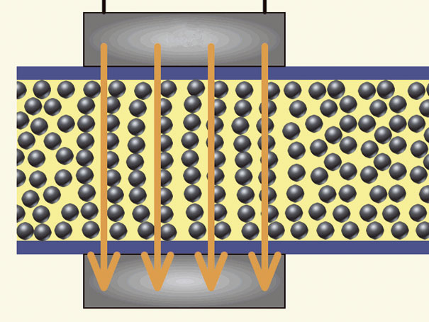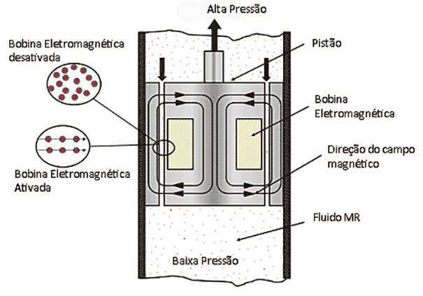 Quando uma tensão é aplicada à bobina no pistão por meio de um pulso fornecido por uma unidade de controle, é criado um campo magnético que alinha as partículas magnéticas no fluido, na direção do campo magnético aplicado, que é transversal à direção do fluxo do fluido, criando uma restrição do fluxo através dos orifícios do pistão. Fig.3