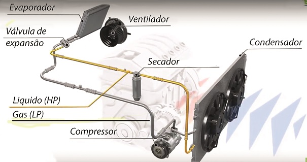 Condensador: localizado na parte frontal do veículo, resfria o vapor que retorna ao seu estado líquido.