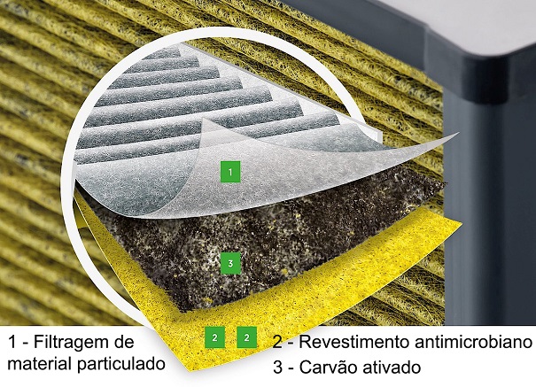 Filtros de partículas: capturam partículas e poeira maiores que 0,1 µm (por exemplo, pólen, fuligem, poeira de pneus).
