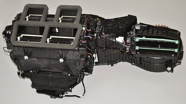 Caixa de ar: localizada abaixo do painel e conectada à antepara (no lado do capô do motor), ajusta a temperatura e a distribuição de ar na cabine de acordo com os requisitos do usuário. Quando atravessa o evaporador, o refrigerante evapora a baixa temperatura e baixa pressão. Então o ar passa e o evaporador é resfriado, antes de ser soprado na cabine. O radiador aquece o ar que o atravessa, elevando a temperatura da cabine em clima frio.