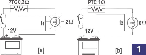 A figura 1a mostra um circuito com um resistor PTC e uma lâmpada. Para a corrente que circula, o resistor PTC apresenta uma resistência de 0,2 ohm. A figura 1b apresenta o mesmo circuito, mas com a lâmpada em curto-circuito. Nesta situação, tenderia a circular uma corrente excessiva, a não ser pela presença do PTC que, ante o aumento de intensidade, aquece. O aquecimento provoca um considerável aumento da sua resistência interna (cinco vezes). No entanto, verifica-se que a corrente i2 é maior que i1. Assim, no circuito, circula uma corrente tal que mantém o PTC aquecido o suficiente para que sua resistência permaneça elevada e, então, limite a corrente de curto-circuito. Ao ser eliminado o curto, a corrente diminui e o PTC esfria, retornando ao seu valor normal.