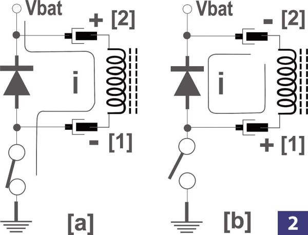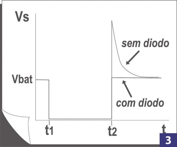 No instante t2 o interruptor abre, provocando o colapso do campo magnético pela interrupção da corrente i (figura 2b). Nesse momento, aparece uma força contraeletromotriz que tenderia a estabelecer o terminal [1] positivo com relação ao [2]. No entanto, isso não é possível pela presença do diodo que, ao entrar em condução, permite a circulação da corrente i, a qual descarrega o solenoide. Com isto, é eliminado o pico de tensão. A corrente é máxima no momento em que abre o interruptor, e dura o tempo necessário à descarga do solenoide, que é de alguns milissegundos ou menos, na maior parte dos casos.