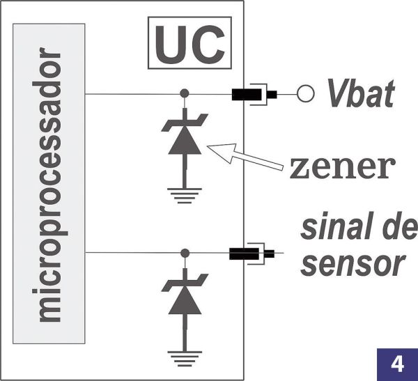 A figura 4 mostra diodos zener como proteção do circuito de alimentação e de uma linha de entrada de sinal de sensor.