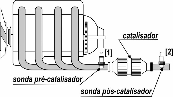 2. Depois do catalisador (sonda pós-catalisador; posição [2]): Utilizado para avaliar a eficiência do catalisador. Este sensor é obrigatório nos sistemas que aderem ao padrão OBD II.