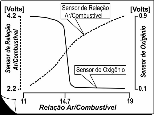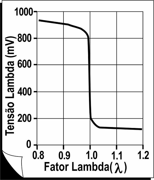 Quando devidamente aquecido, este sensor é um gerador de tensão que apresenta uma curva de resposta quase linear para misturas com fator entre 0,75 e 1,5, não apresentando variação brusca para = 1. Ou seja, o sinal de saída é proporcional à concentração de O2, ainda que não de forma linear. Com o objetivo de ilustrar as diferentes respostas, a figura abaixo mostra as curvas características do sensor de relação e do sensor de oxigênio (sonda Lambda), considerando que o combustível é gasolina, com relação ar/combustível ideal de 14,7:1.