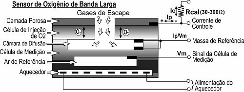 A associação de uma célula de injeção com uma célula de medição constitui o Sensor de Relação Ar/Combustível ou Sensor de O2 de Banda Larga de 2 células.